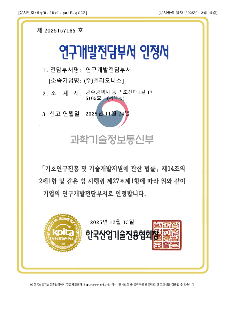Certificate of recognition for corporate R&D center